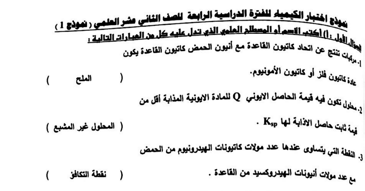 الصف الثاني عشر إجابة اختبار كيمياء للفصل الثاني