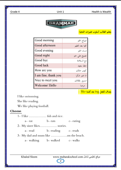 مذكرة انجليزية الوحدة الأولى للصف الرابع إعداد خالد سليم