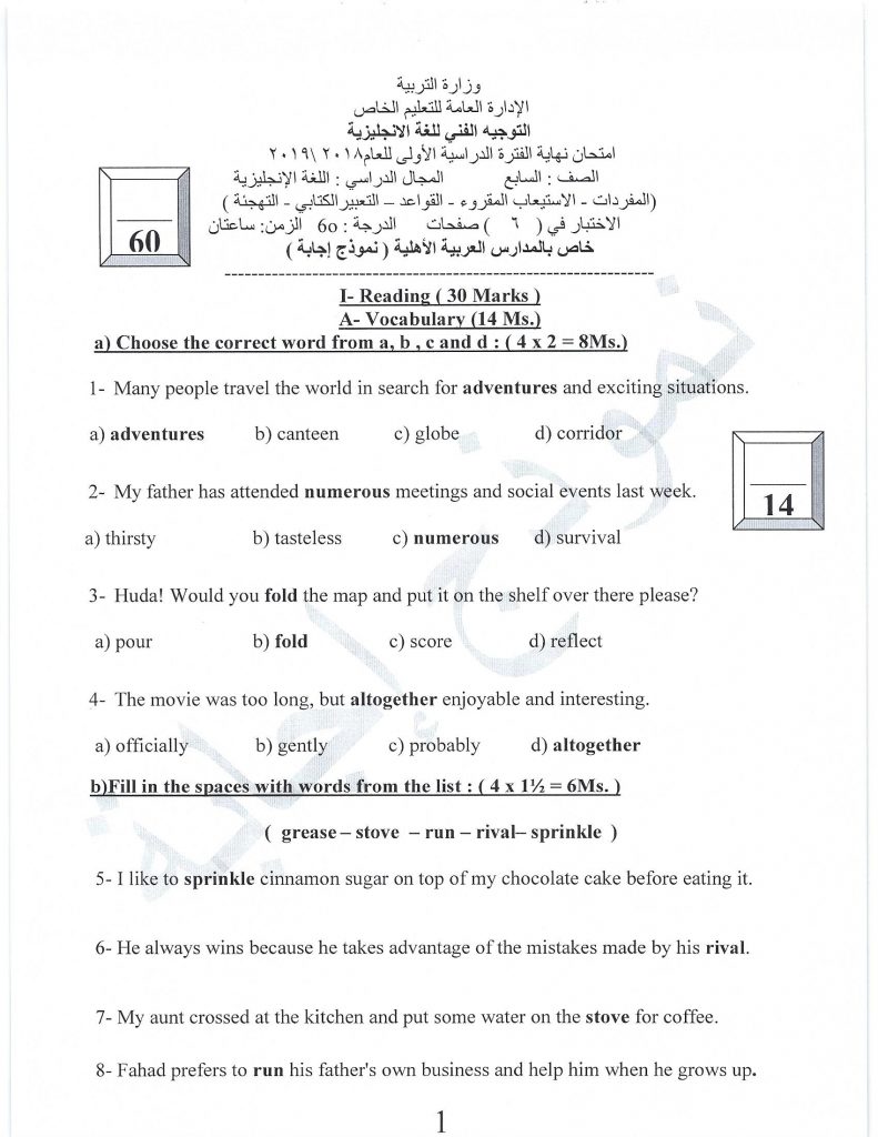 نموذج الاجابة انجليزي الصف السابع التعليم الخاص 2018-2019