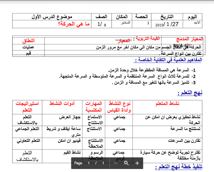 تحضير الدرس الاول علوم الحركة الصف الثامن