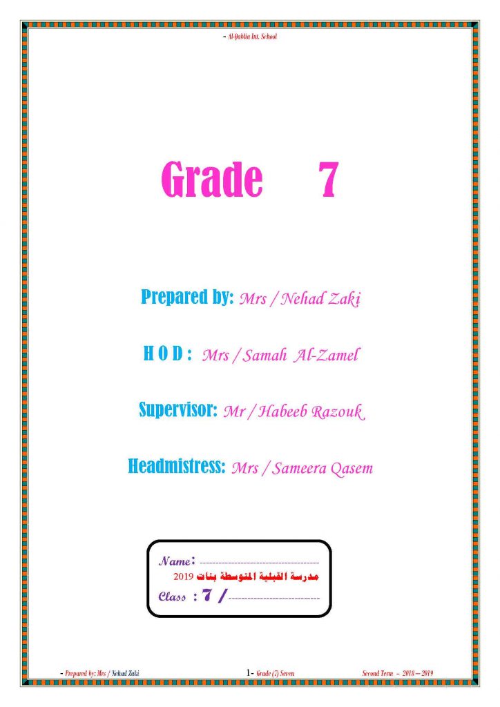 مذكرة لغة إنجليزية للصف السابع الفصل الثاني مدرسة القبلية المتوسطة 2019