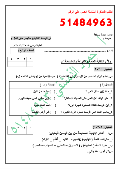 مرفق لكم نموذج اختبار للوحدة الثانية لغة عربية للصف الرابع الفصل الثاني إعداد أ. محمود الدمشقي 2018-2019
