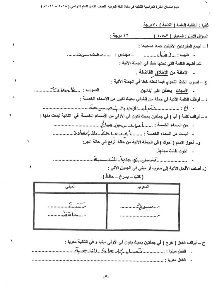 نموذج اجابة اختبار لغة عربية الصف الثامن الفصل الثاني المنهج الجديد كفايات .