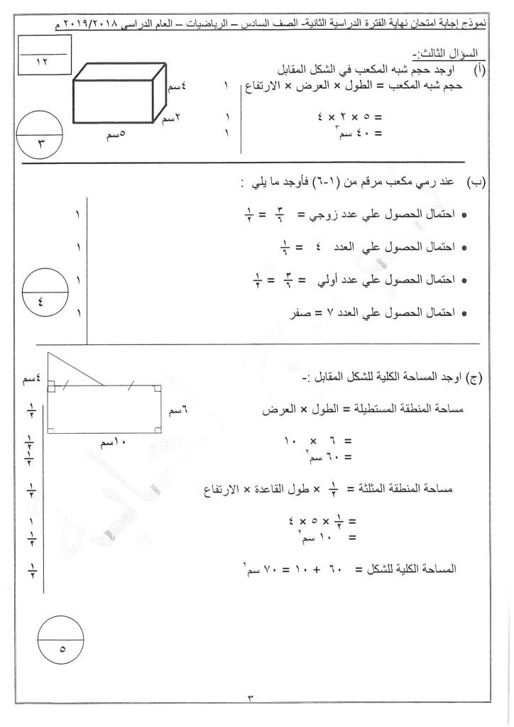 نموذج اجابة اختبار رياضيات الصف السادس الفصل الثاني الاحمدي 2018-2019