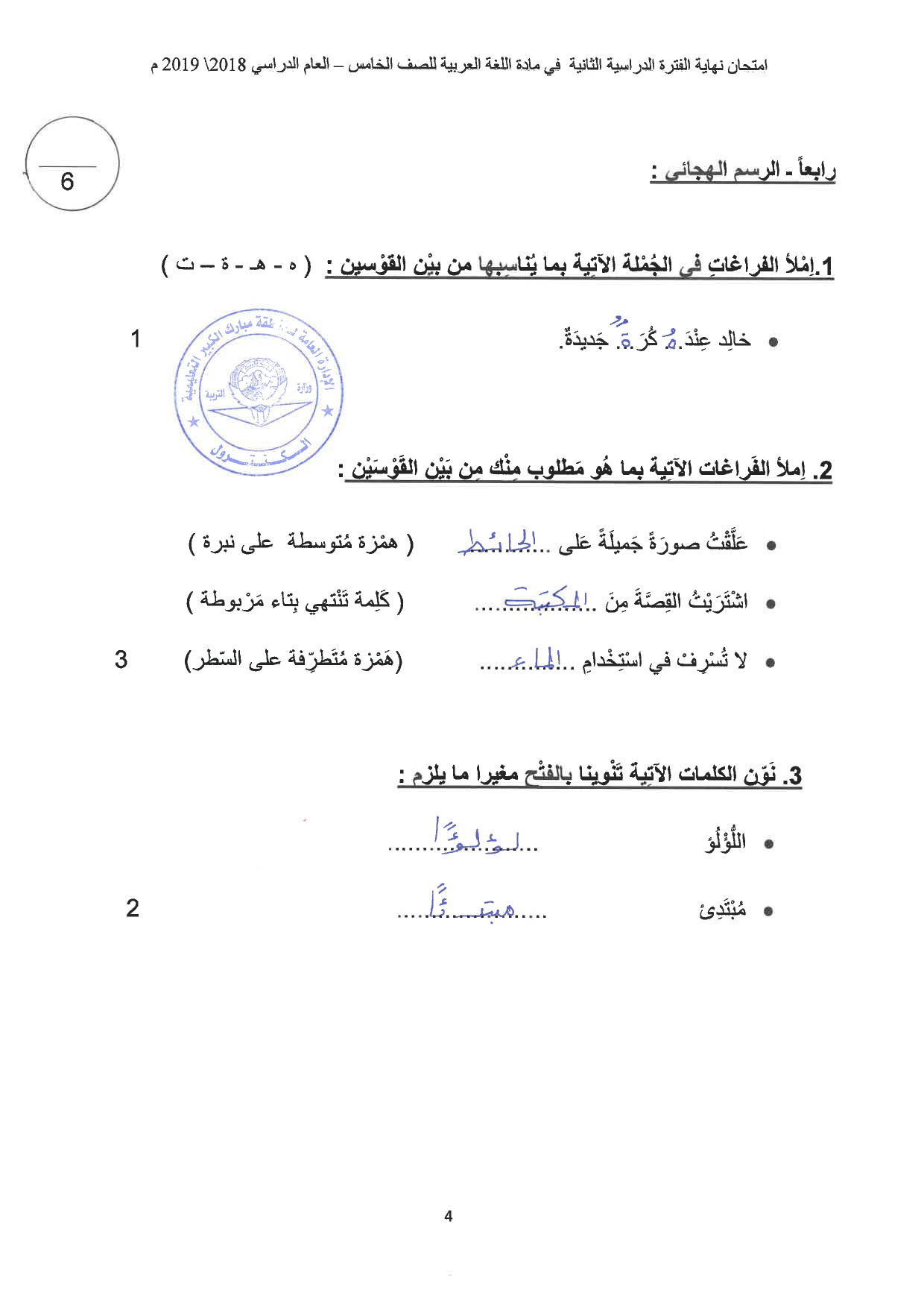 صور نموذج اجابة اختبار لغة عربية الصف الخامس الفصل الثاني مبارك الكبير 2018-2019