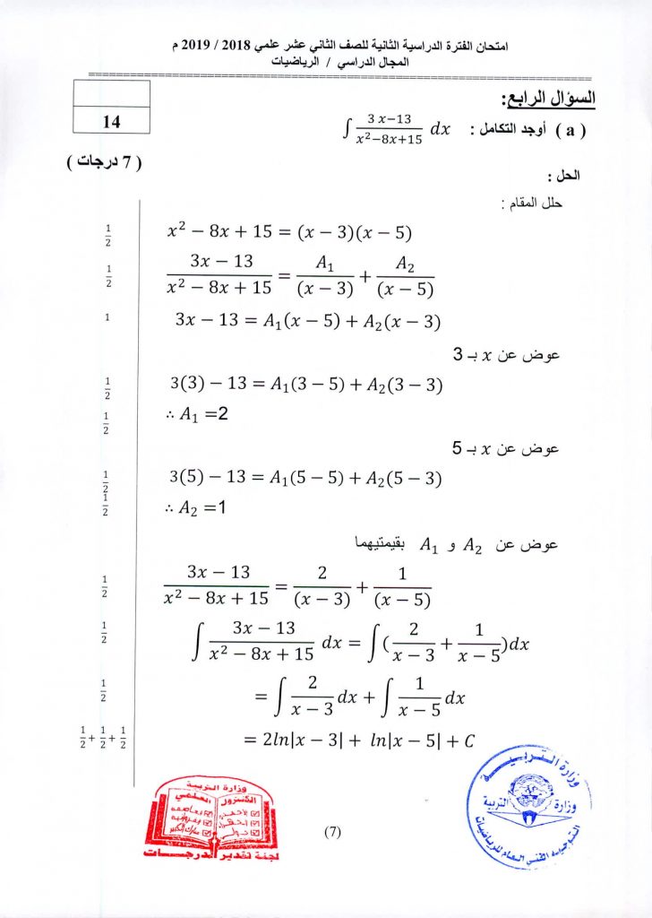 نموذج اجابة امتحان الرياضيات الثاني عشر علمي فصل ثاني 2019