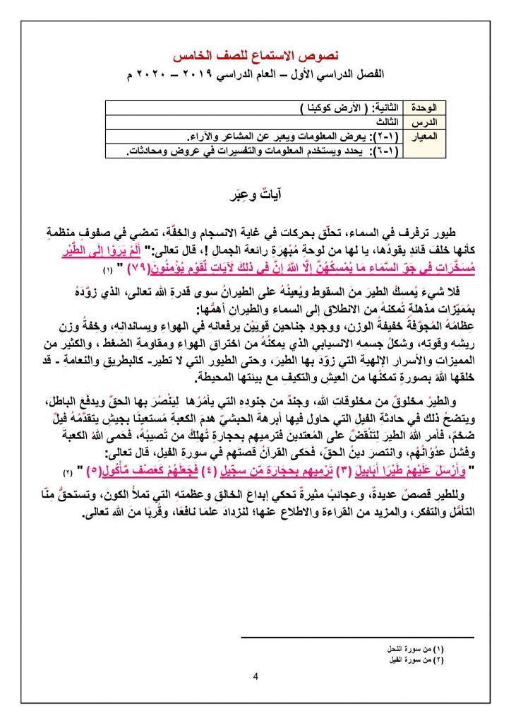 نصوص الاستماع للصف الخامس الفصل الأول آيات وعبر
