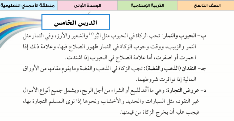 الدرس الخامس من كتاب تربية اسلامية يتمحور حول عدد من الموضوعات التي تتعلق التعاليم الدينية وشرعية ومما جاء من موضوعات نذكر لكم: