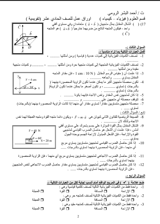 اوراق عمل فيزياء الصف الحادي عشر ثانوية احمد البشر الرومي الفصل الاول