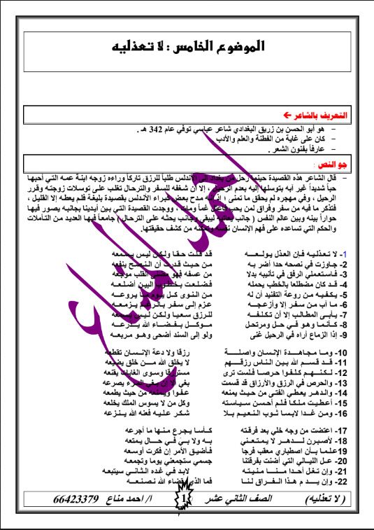 المزيد من محتويات درس لا تعذليه لغة عربية الصف الحادي عشر الاستاذ احمد المناع