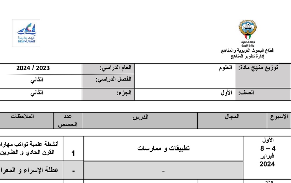 توزيع منهج علوم الصف الأول الفصل الثاني 2023-2024