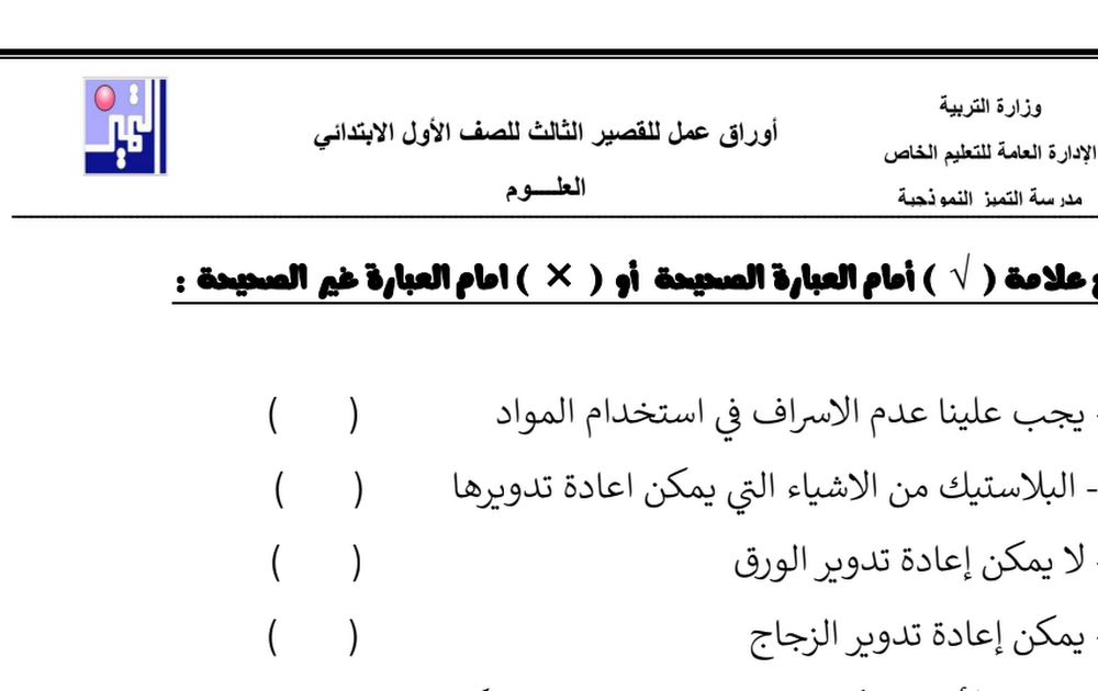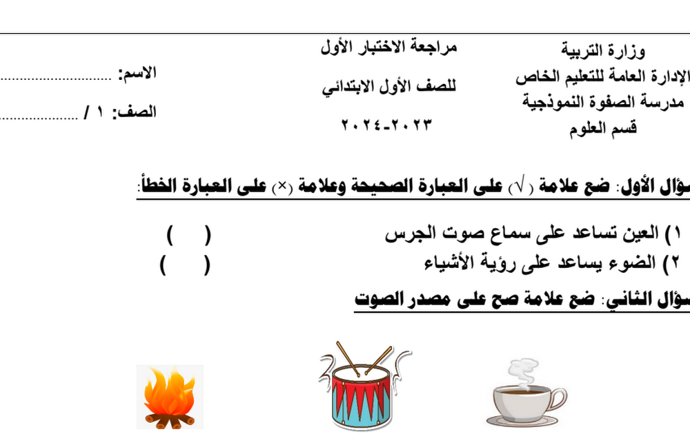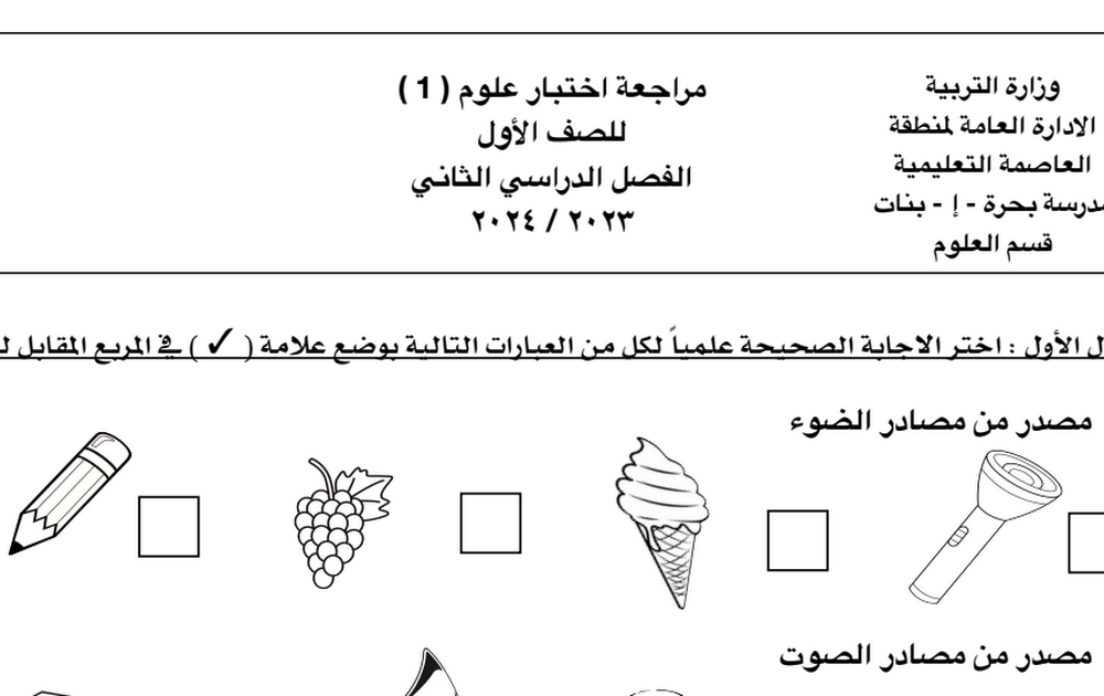 مراجعة الاختبار الأول علوم الصف الأول الفصل الثاني 2023/2024 – التعليم الخاص