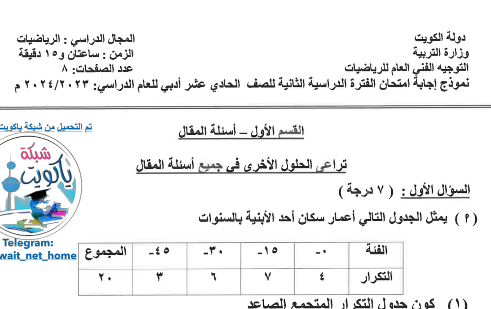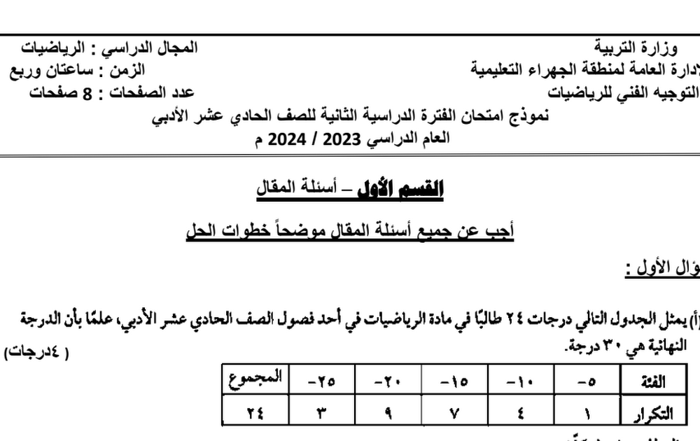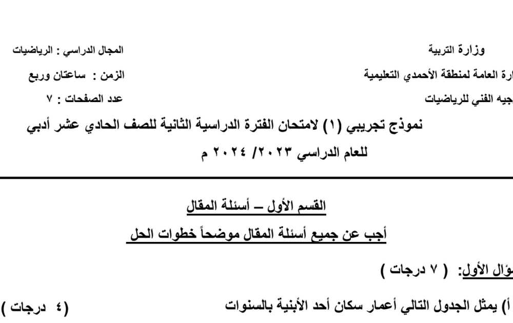 نموذج امتحان نهائي احصاء الصف الحادي عشر أدبي 2023/2024 – الجهراء