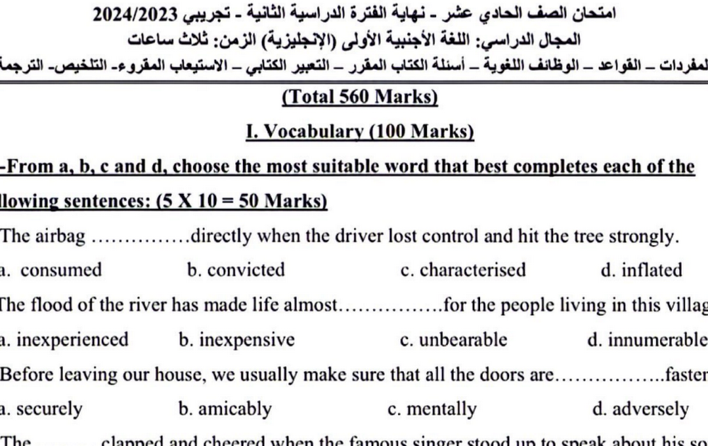 الامتحان التجريبي لغة انكليزية الصف الحادي عشر الفصل الثاني 2023/2024