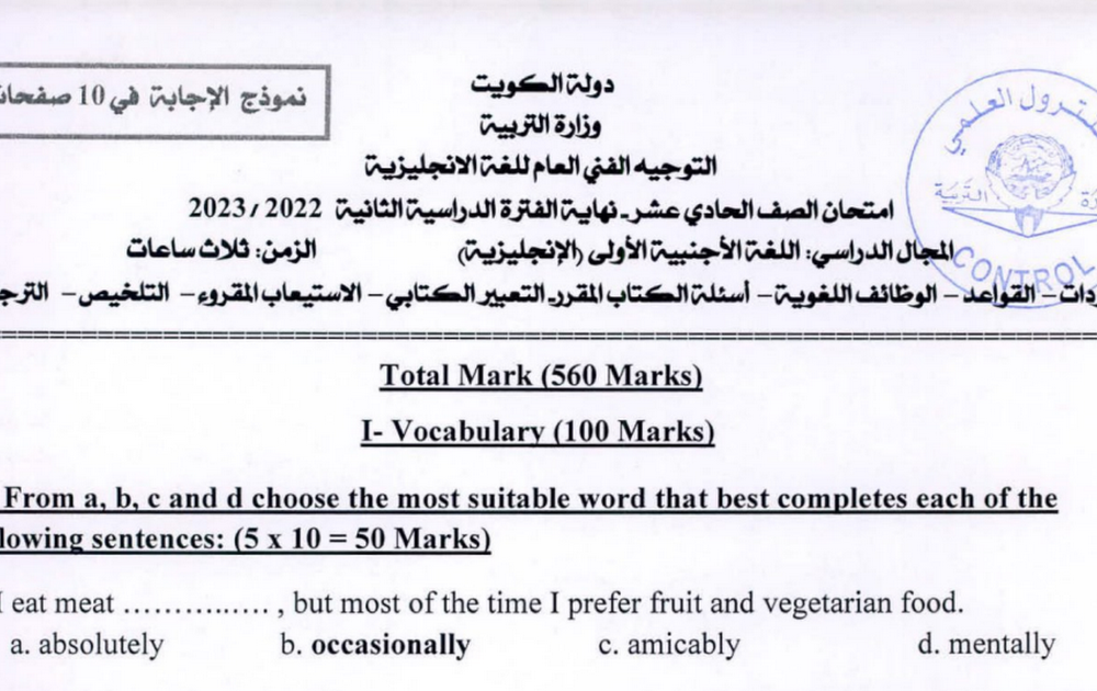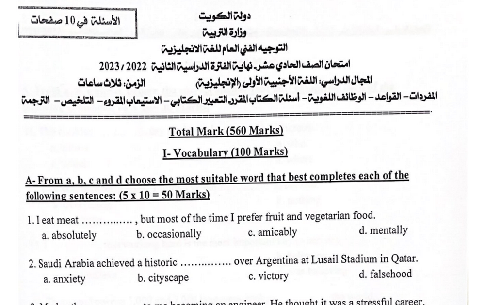 امتحان لغة انجليزية الصف الحادي عشر الفصل الثاني 2022-2023