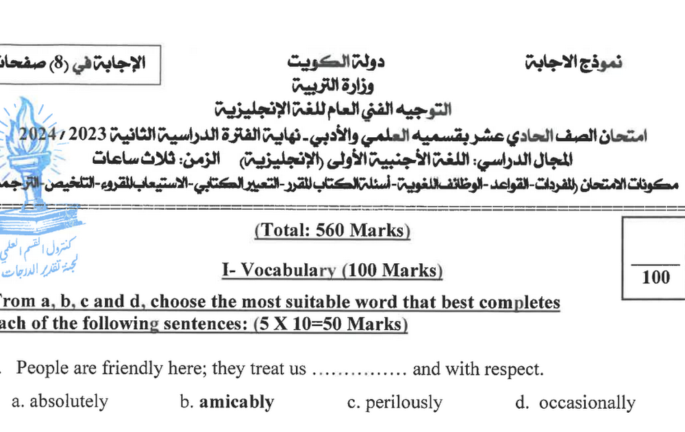 نموج اجابة امتحان لغة انجليزية الصف الحادي عشر الفصل الثاني 2023-2024