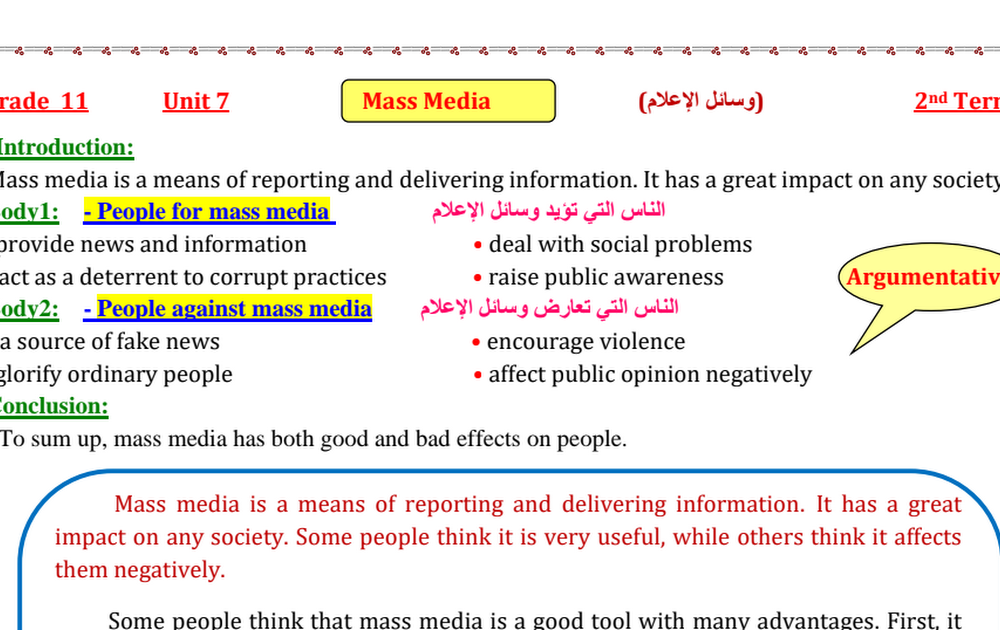 مذكرة تعبير لغة انكليزية الصف الحادي عشر الفصل الثاني أ هاني محمد