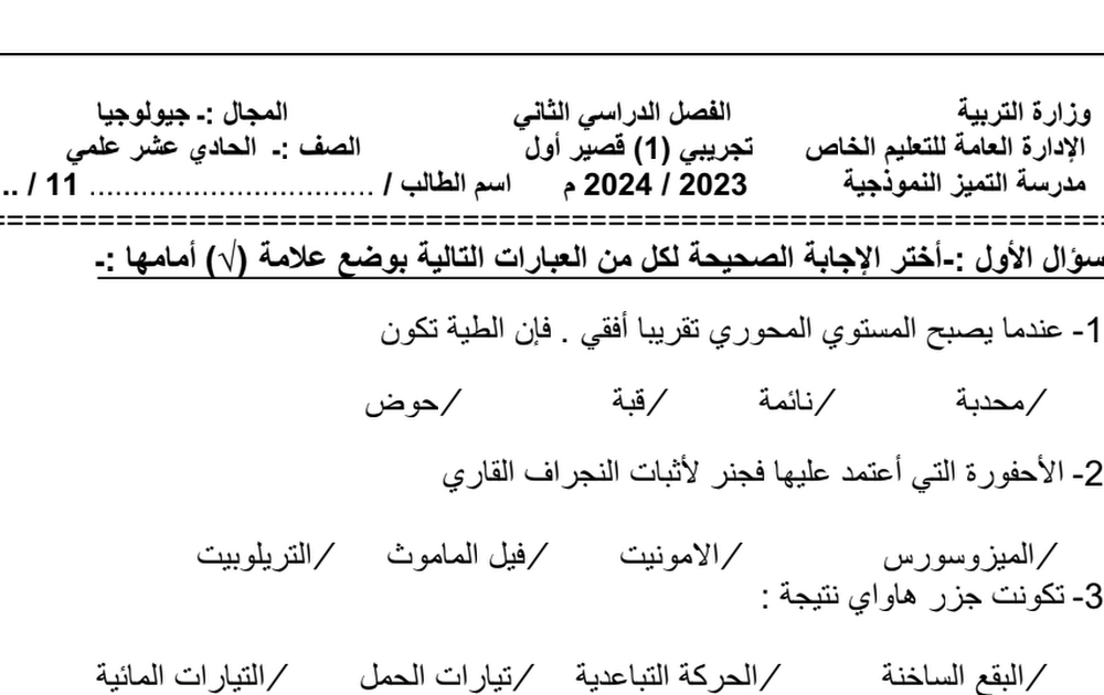 أسئلة امتحانات تجريبية قصير أول جيولوجيا الصف الحادي عشر علمي الفصل الثاني 2023/2024