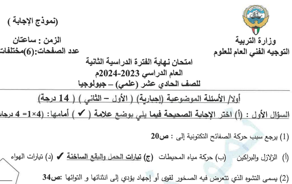 اختبارات تجريبية قصير أول جيولوجيا الصف الحادي عشر علمي الفصل الثاني 2023/2024 – التعليم الخاص