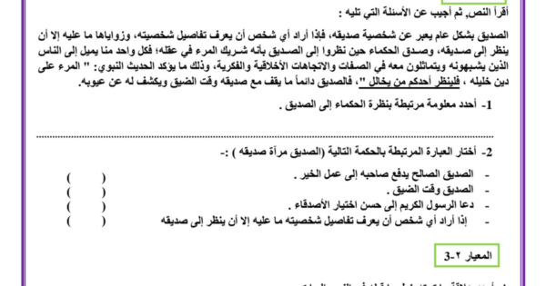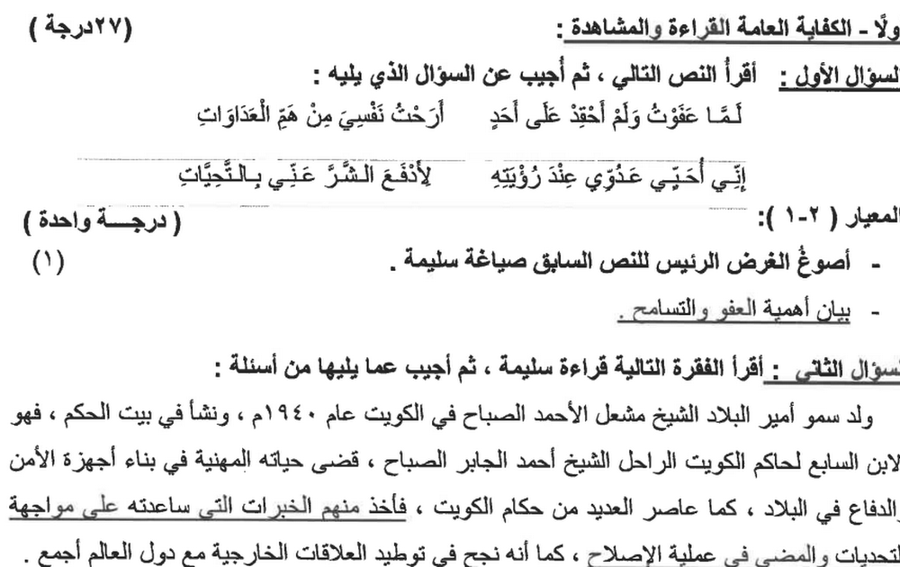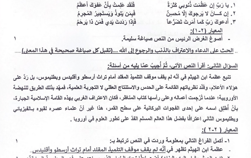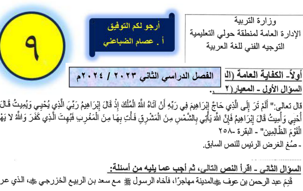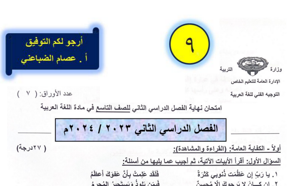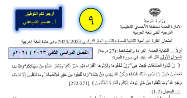 نموذج امتحان لغة عربية الصف التاسع الفصل الثاني 2023/2024 – حولي أ عصام الضباعني