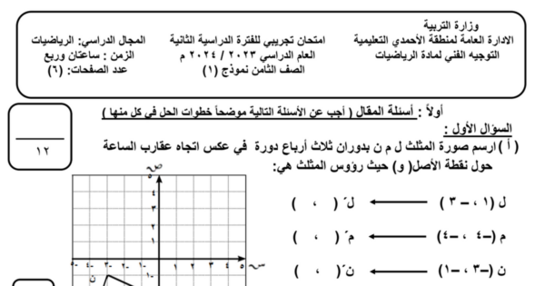 امتحان تجريبي نموذج (1) رياضيات الصف الثامن الفصل الثاني 2023/2024 – الأحمدي