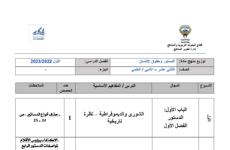 توزيع منهج الدستور وحقوق الانسان للصف الثاني عشر أدبي الفصل الأول 2022-2023