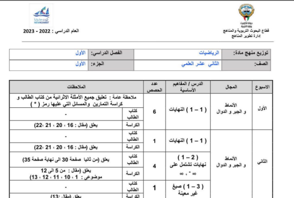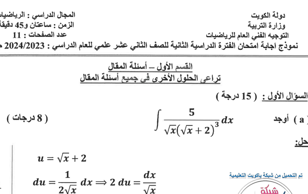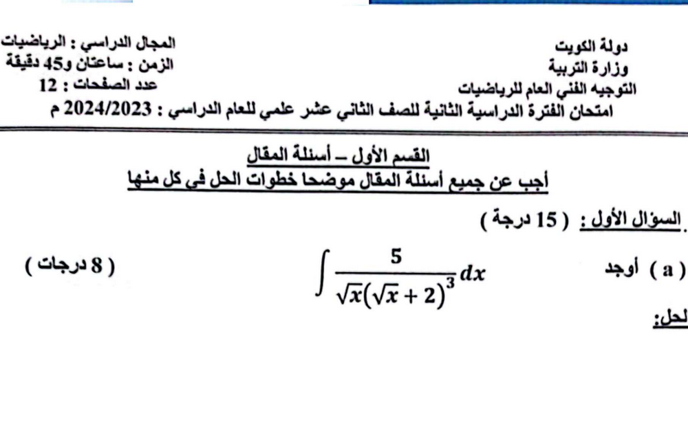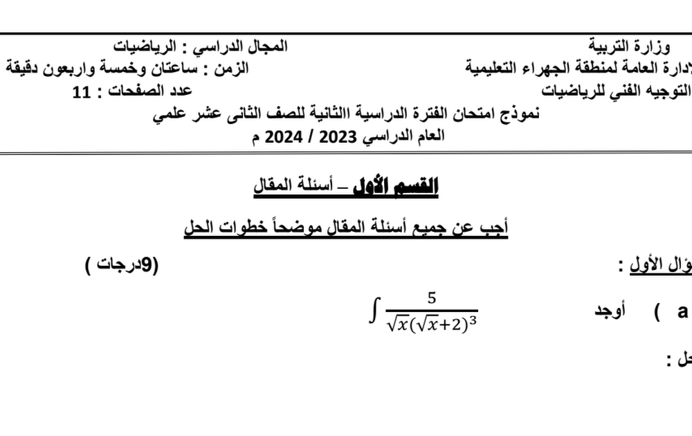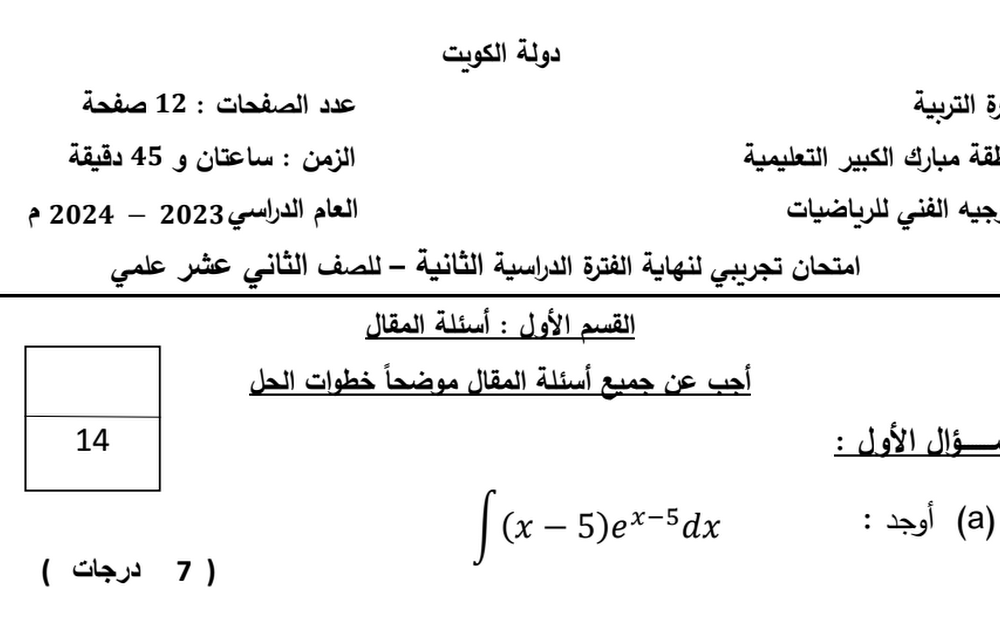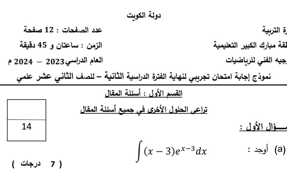 نموذج امتحان نهائي رياضيات الصف الثاني عشر علمي الفصل الثاني 2023/2024 – الجهراء