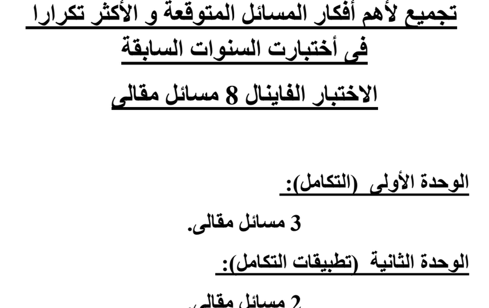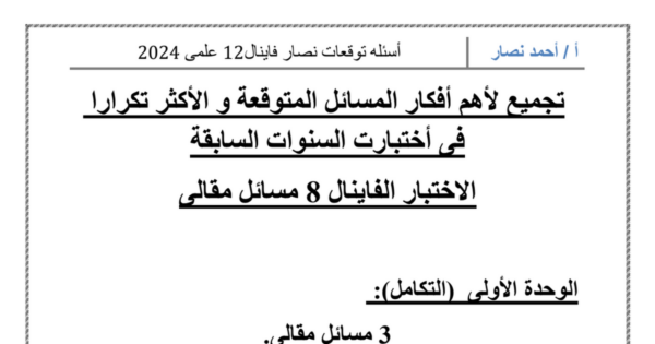 توقعات الامتحان النهائي رياضيات الصف الثاني عشر علمي 2024 أ أحمد نصار