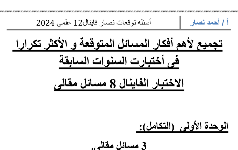 اجابة توقعات الامتحان النهائي رياضيات الصف الثاني عشر علمي 2024 أ أحمد نصار