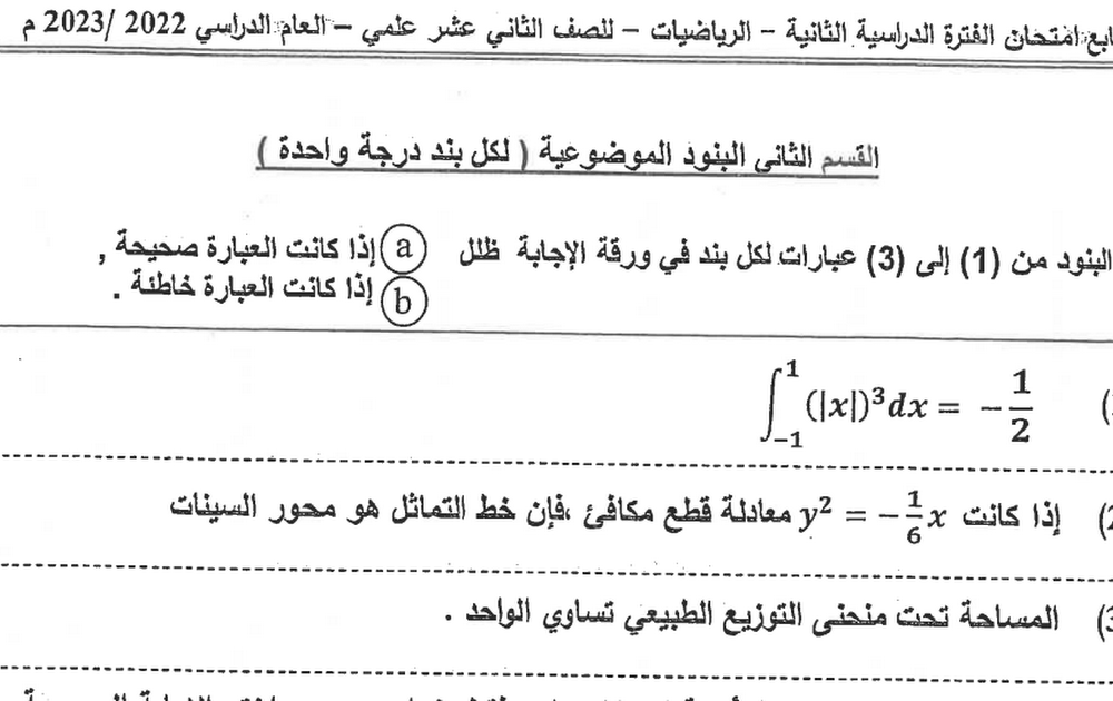 امتحان نهائي رياضيات الصف الثاني عشر علمي الفصل الثاني 2022/2023