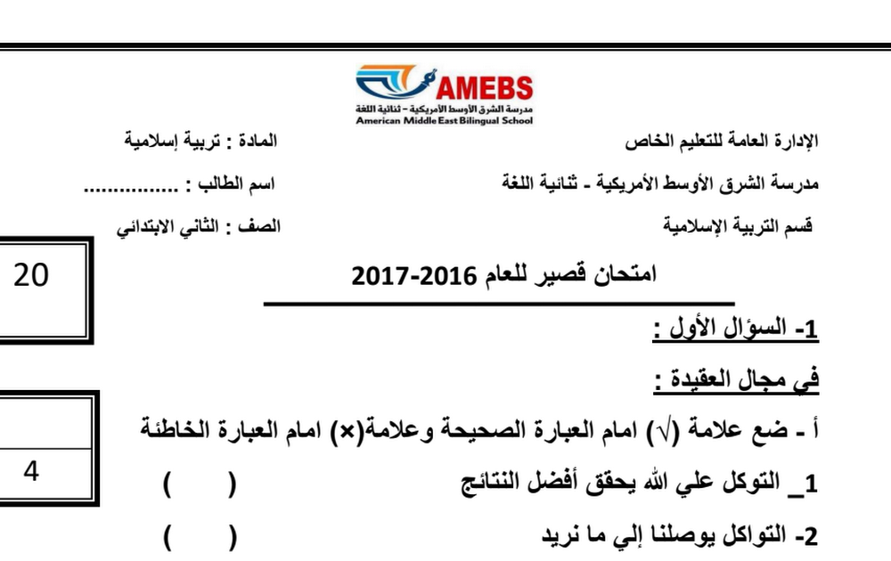 اختبار قصير (1) تربية إسلامية الصف الثاني الفصل الثاني 2016/2017 – التعليم الخاص
