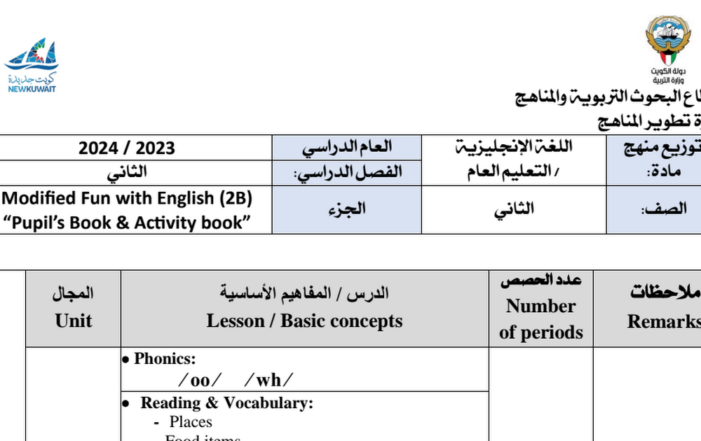 توزيع منهج اللغة الانكليزية الصف الثاني الفصل الثاني 2023-2024