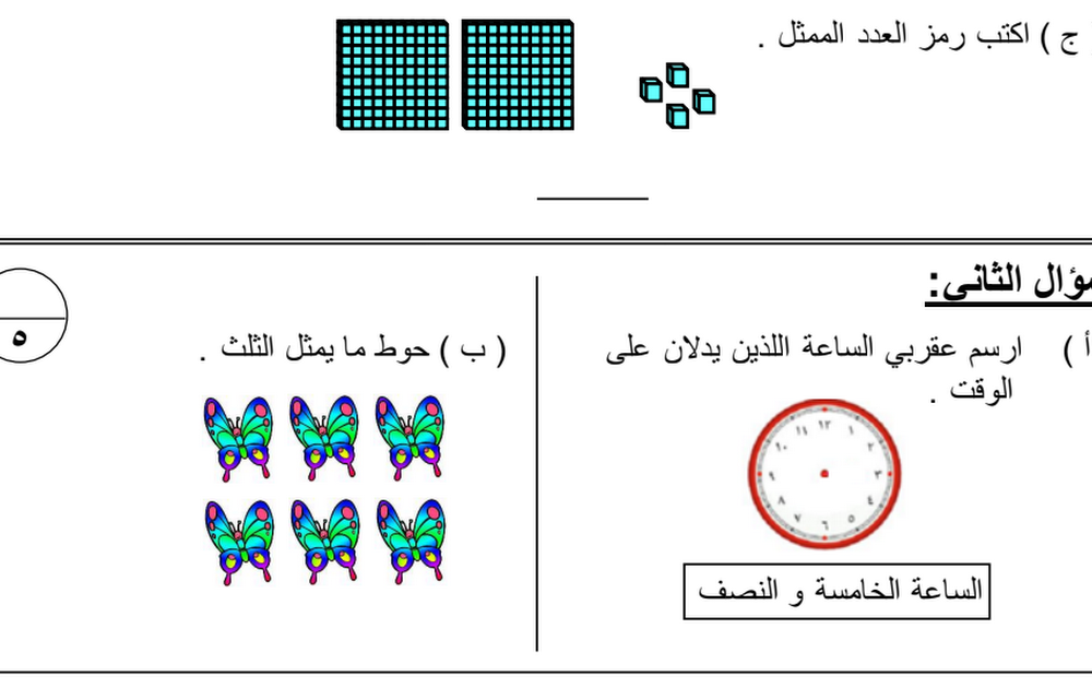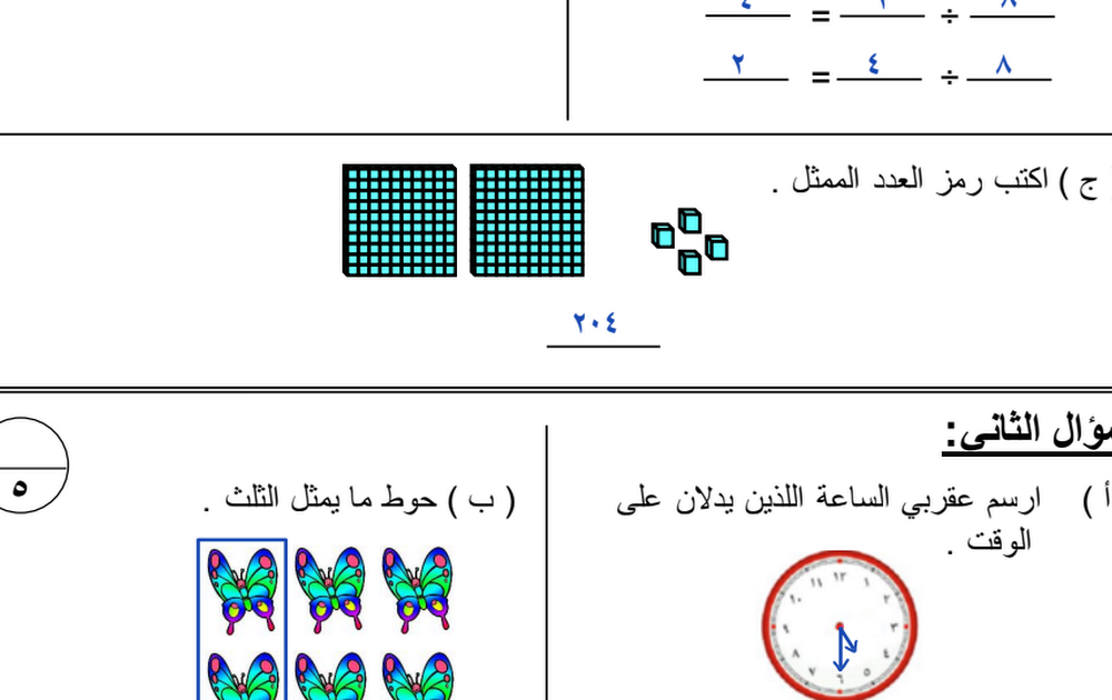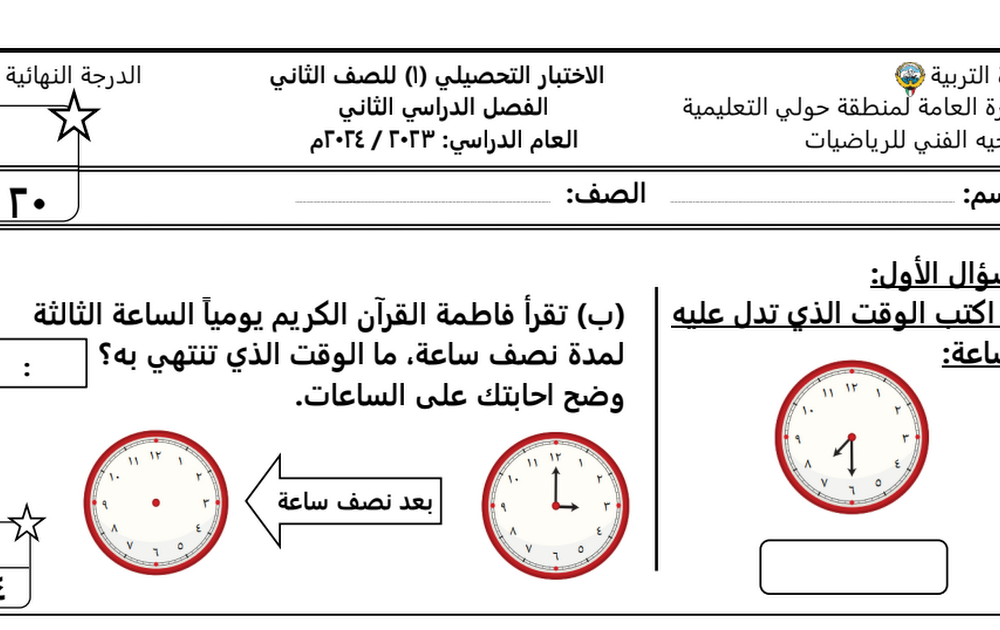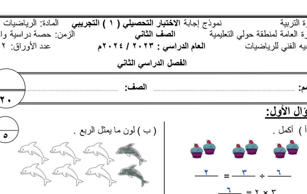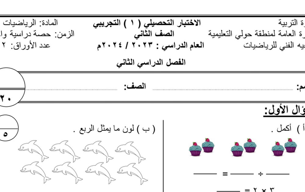نموذج (1) الاختبار التحصيلي (1) رياضيات الصف الثاني الفصل الثاني 2023/2024 – حولي