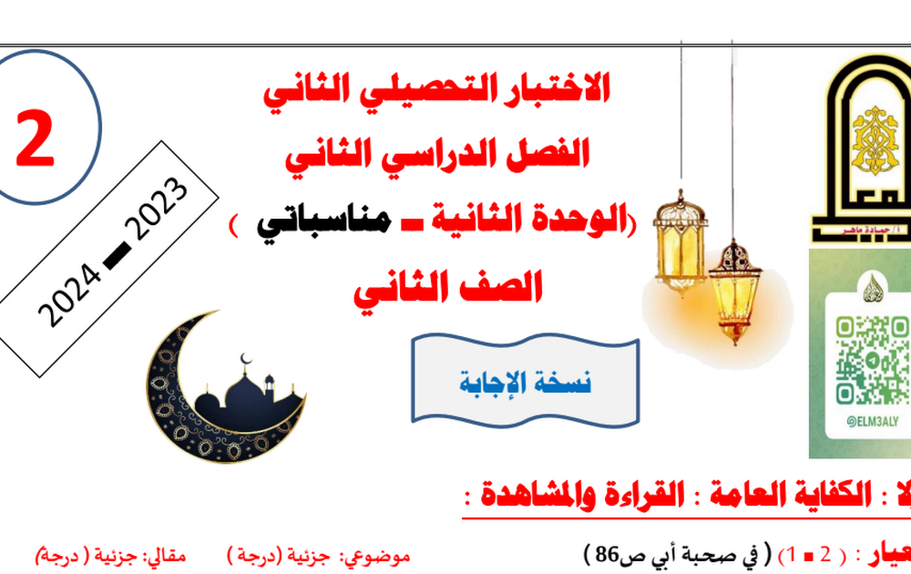 نموذج اجابة الاختبار التحصيلي الثاني لغة عربية الصف الثاني الفصل الثاني 2023/2024 أ حمادة ماهر