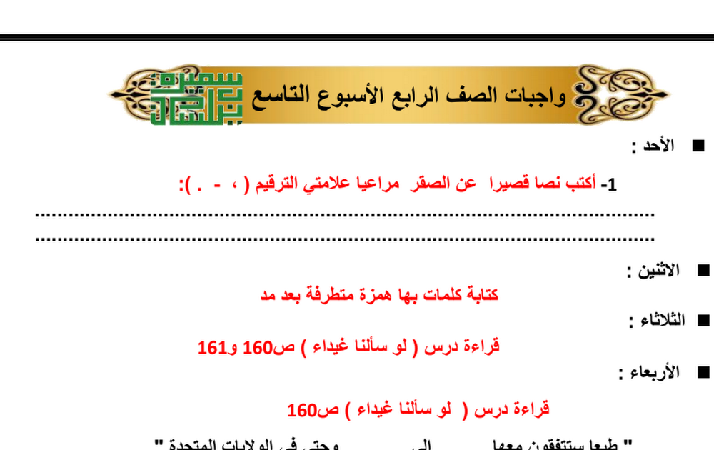 واجبات الأسبوع 9+10 لغة عربية الصف الرابع الفصل الثاني أ سميرة بيلسان
