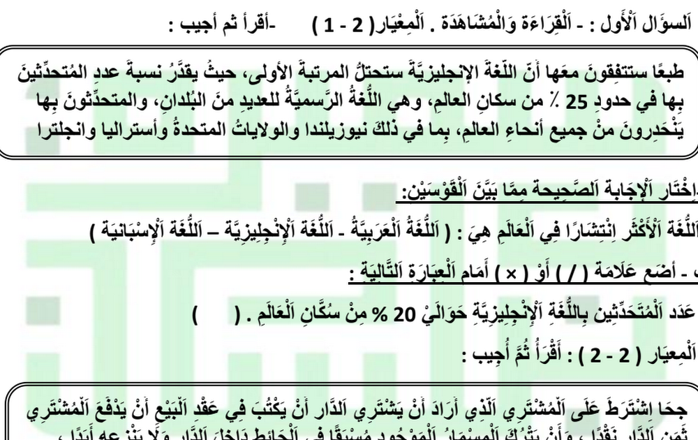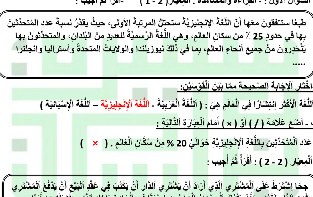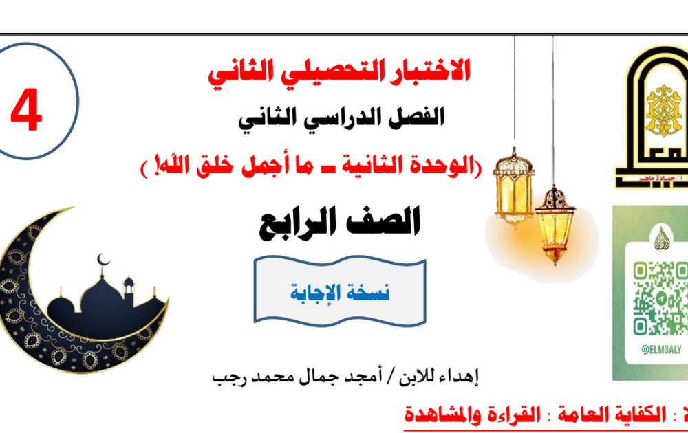 نموذج اجابة الاختبار التحصيلي الثاني لغة عربية الصف الرابع الفصل الثاني 2023/2024 أ حمادة ماهر