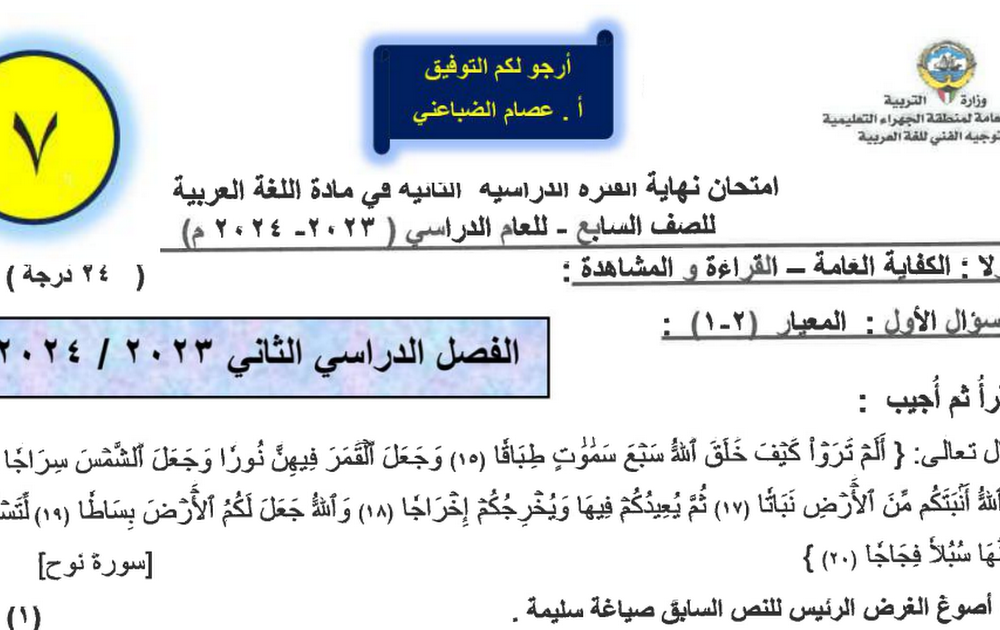امتحان نهائي لغة عربية الصف السابع الفصل الثاني 2023/2024 أ عصام الضباعني – الجهراء