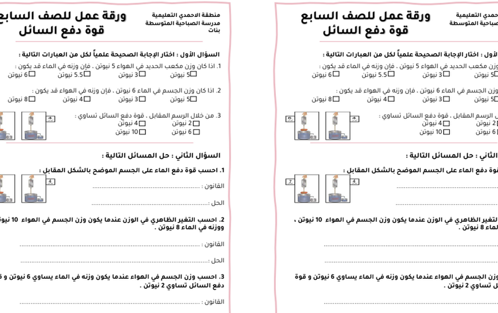 ورقة عمل درس قوة دفع السائل علوم الصف السابع الفصل الثاني – الأحمدي