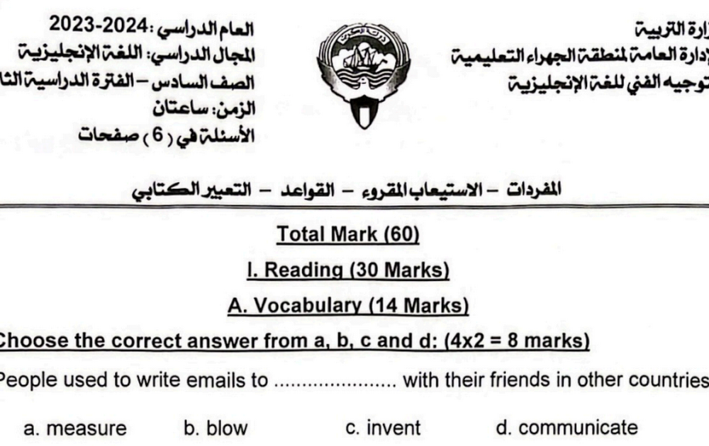 امتحان لغة انكليزية الصف السادس الفصل الثاني – الجهراء