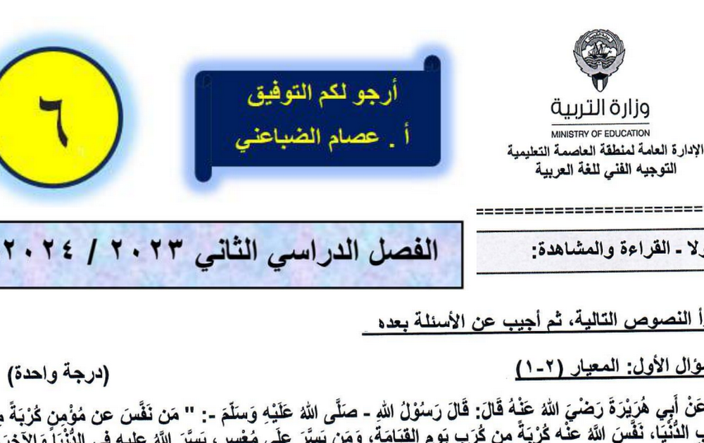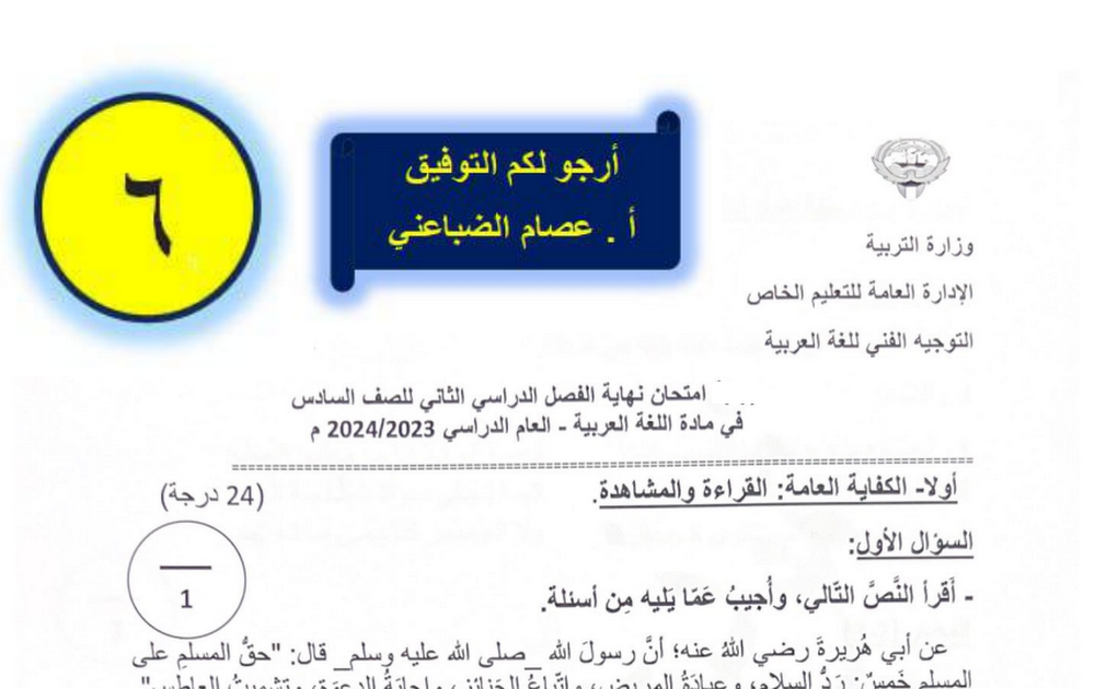 امتحان نهائي لغة عربية الصف السادس الفصل الثاني 2023/2024 أ عصام الضباعني – التعليم الخاص