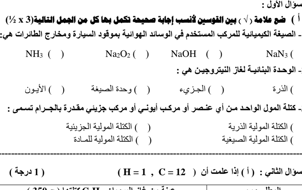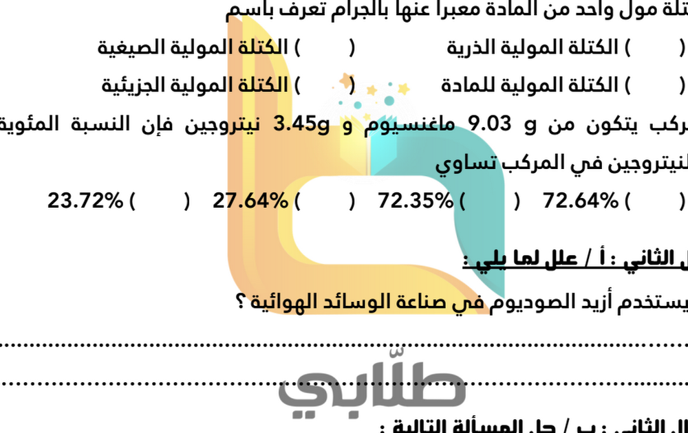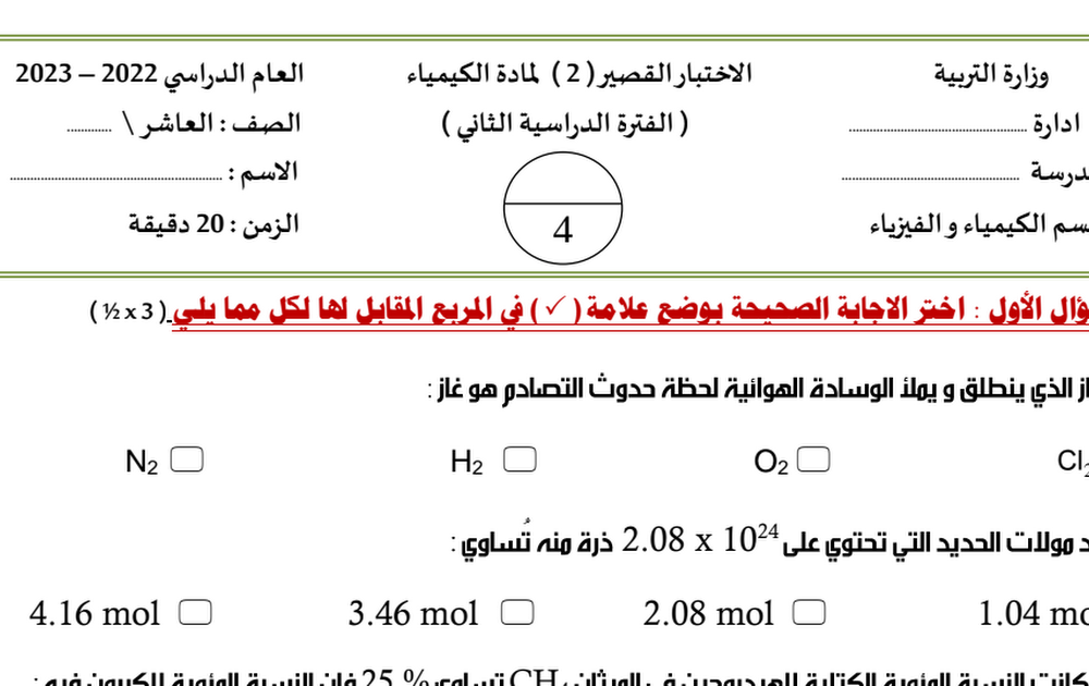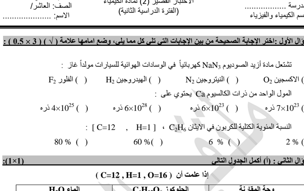 نماذج الاختبار القصير الثاني كيمياء الصف العاشر الفصل الثاني أ أحمد جبريل