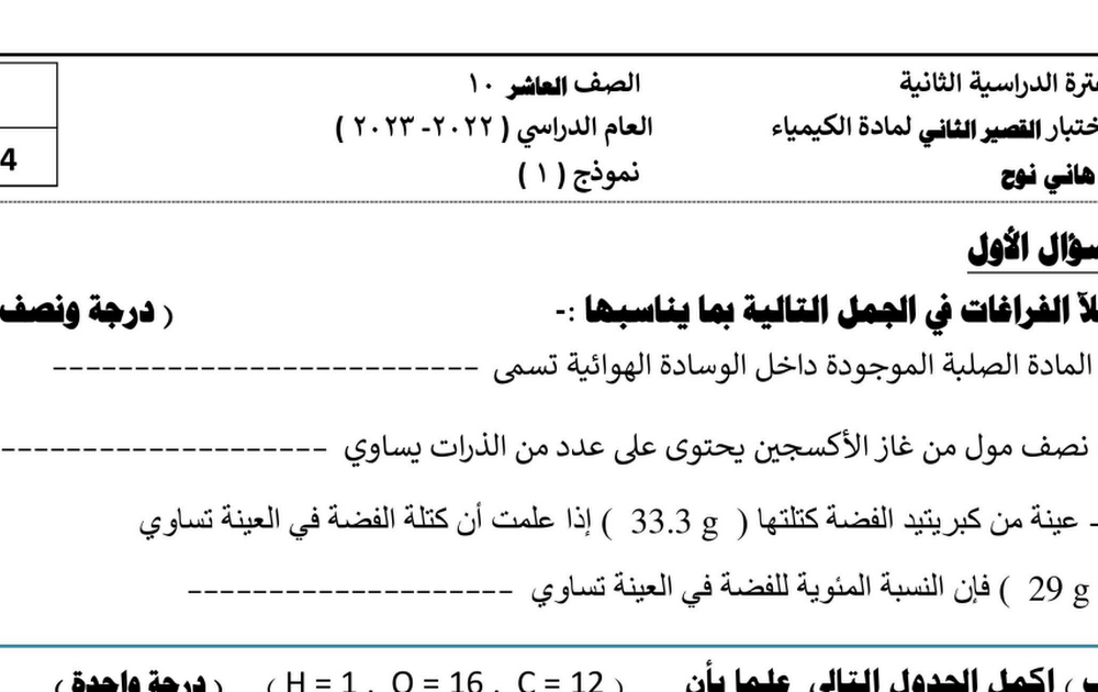 نماذج الاختبار القصير الثاني كيمياء الصف العاشر الفصل الثاني 2022/2023 أ هاني نوح