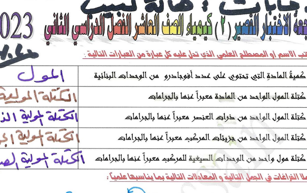 حل نماذج الاختبار القصير الثاني كيمياء الصف العاشر الفصل الثاني 2022/2023