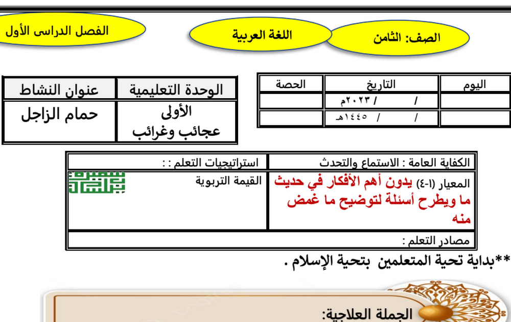 التحضير الكتابي للأسبوع الأول لغة عربية الصف الثامن الفصل الأول أ سميرة بيلسان