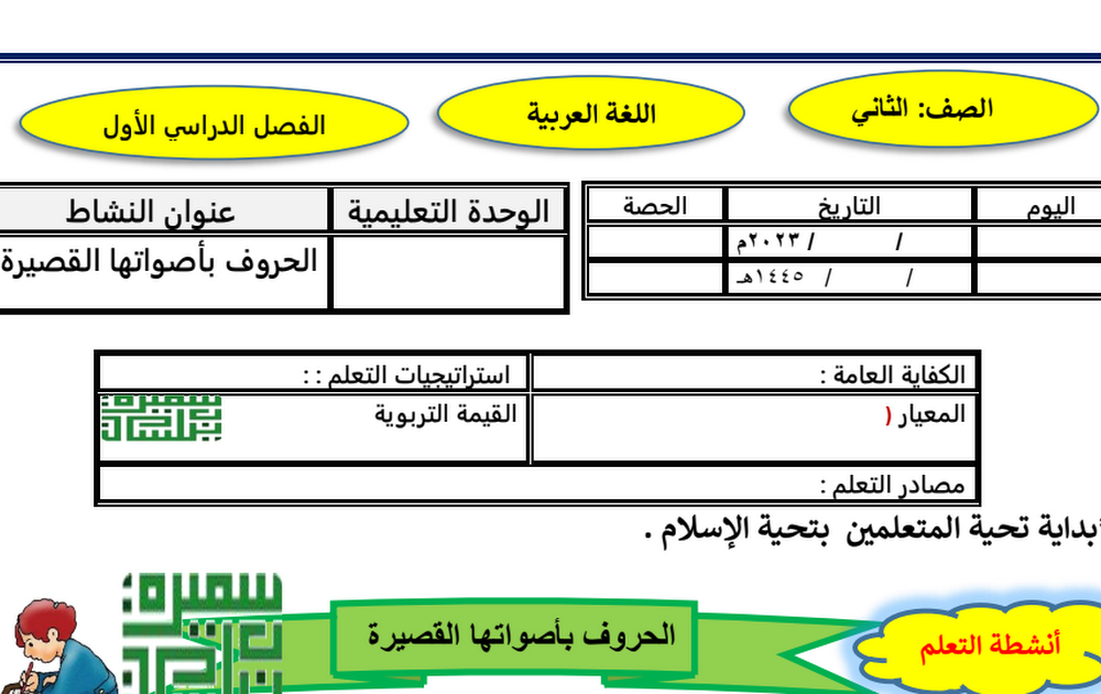 التحضير الكتابي للأسبوع الأول لغة عربية الصف الثاني الفصل الأول أ سميرة بيلسان