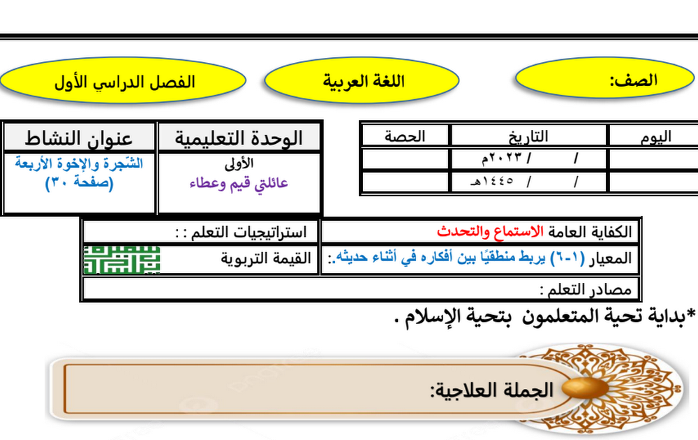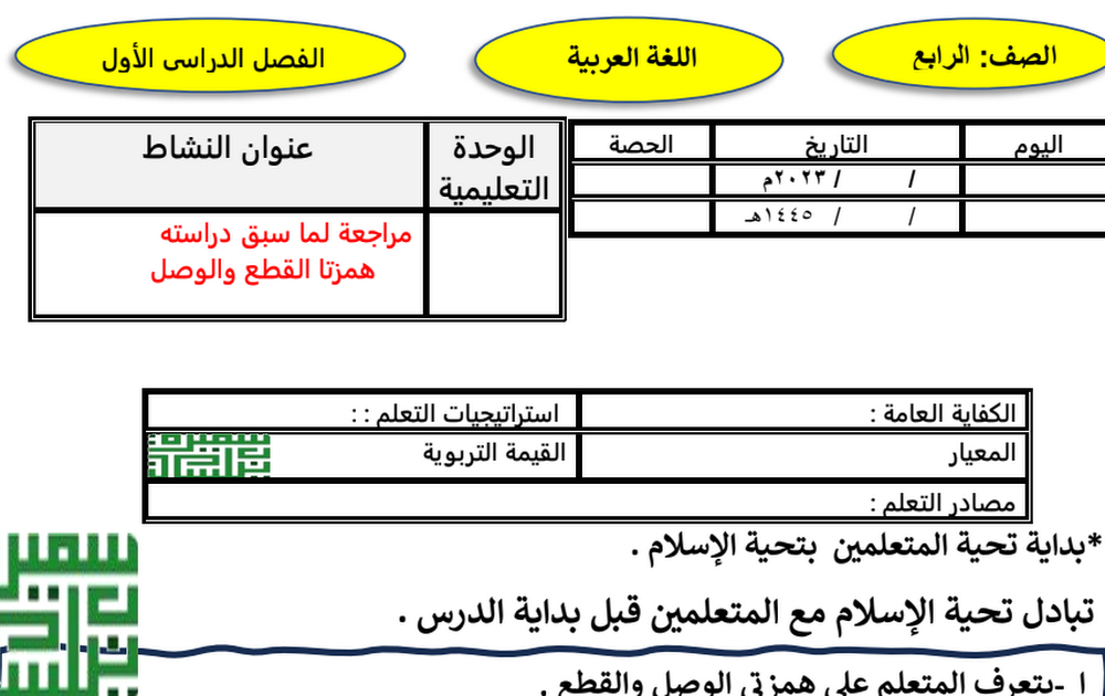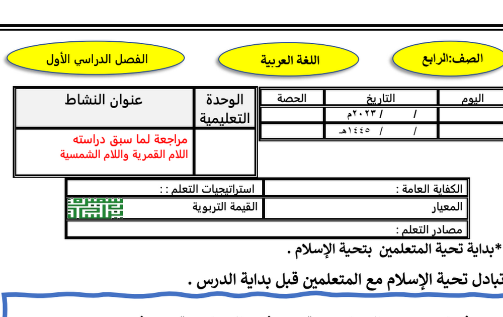 التحضير الكتابي للأسبوع الأول لغة عربية الصف الرابع الفصل الأول أ سميرة بيلسان