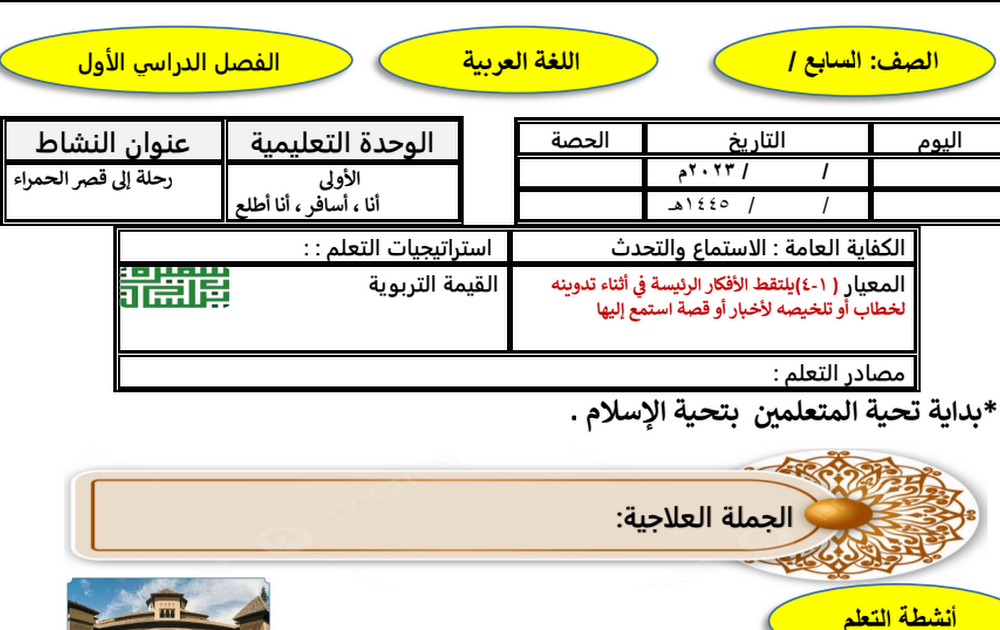التحضير الكتابي للأسبوع الأول لغة عربية الصف السابع الفصل الأول أ سميرة بيلسان